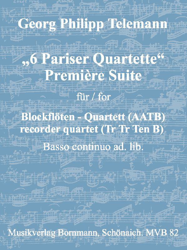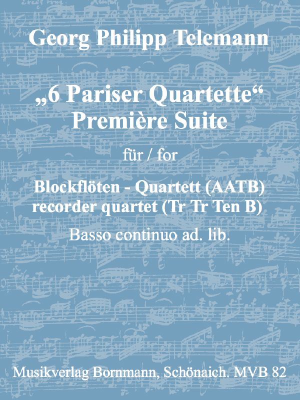 Kaum ein anderer deutscher Komponist des 18. Jahrhunderts war so vertraut mit dem französischen Musikstil wie Telemann. 1737/38 unternahm Telemann auf Einladung der Virtuosen Michel Blavet (Flöte), Jean Pierre Guignon (Violine), Jean-Baptiste Forcroy (Viola da Gamba) und Edouard (Violoncello) eine Reise nach Paris. In seinem Gepäck trug er u.a. sechs Quartette für Flöte, Violine, Gambe oder Violoncello und Basso continuo, die er bereits 1730 in Hamburg veröffentlicht hatte: 2 Concerti, 2 Sonaten und 2 Suiten. Es sind dies die Quartette 1 bis 6 der sogenannten "Pariser Quartette", mit denen er bei den 'Concerts spirituels' in Paris außerordentlich großen Erfolg hatte. Unsere Ausgaben beinhalten die beiden Suiten komplett und ungekürzt spielbar sowohl für reines Blockflöten-Quartett (AATB) als auch für Blockflöten-Quartett mit Basso continuo. Beide Suiten sind eine kleine Terz nach oben transponiert - zwei voluminöse Bände, bei denen Spielfreude garantiert ist.
